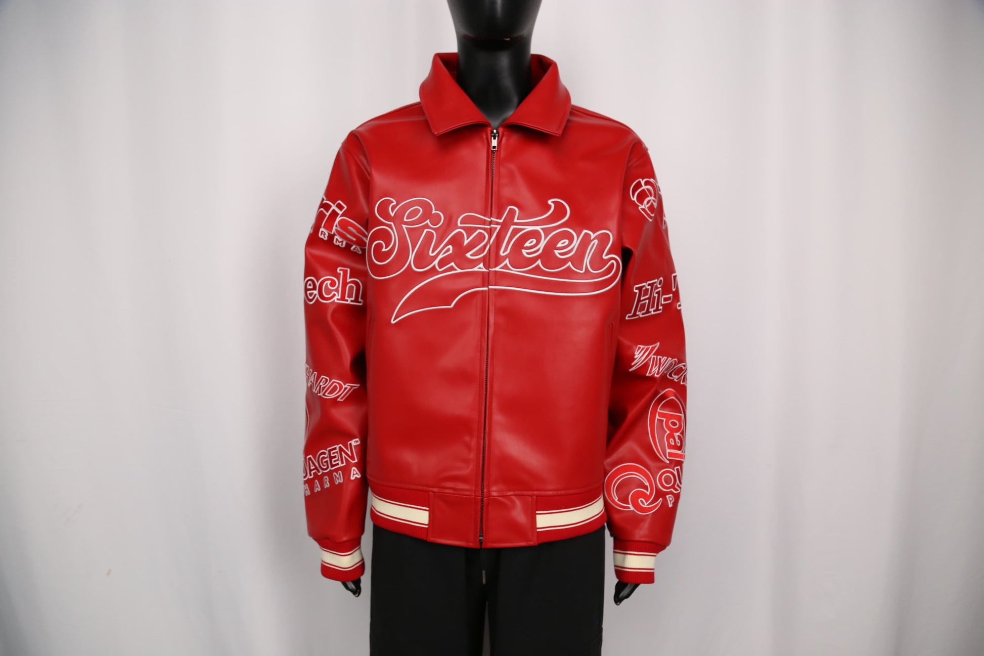 Red Varsity jacket features a smooth premium leather Large Sixteen embroidered across the chest , Refined graphics and typography detailed along the sleeves. Clean zip-front Construction, Structured collar and striped ribbed rib-knit cuffs Custom embroidered sleeves ! Premium Stitching.