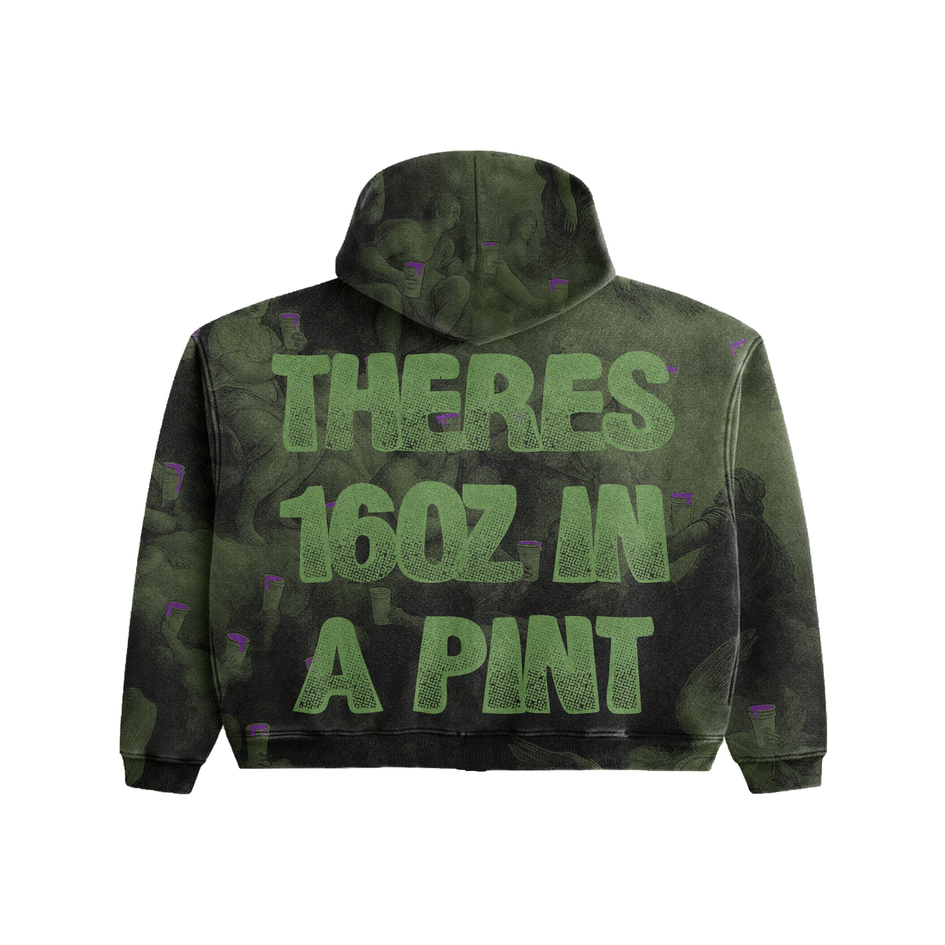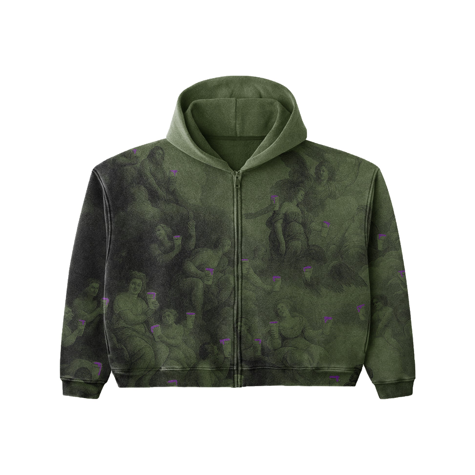 True to size boxy Heavy weight zip-up hoodie in a deep olive washed Layered with an all-over classical mural print that fades into the fabric for a dark art driven look . Each art piece holds a styrofoam with dark purple .Soft fleece interior. Durable outer fabric High Premium fabrics , 450 GSM Premium Fabrics